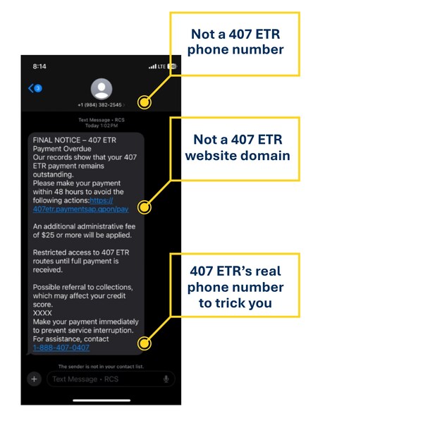 TORONTO, Nov. 7, 2025 /CNW/ - 407 ETR is once again warning customers about another recent surge in fraudulent text messages and websites impersonating 407 ETR. These scams use phishing tactics to obtain personal and financial information, often by creating a sense of urgency and directing customers to click on malicious links. Fraudulent messages may appear convincing, using 407 ETR branding and language similar to legitimate communications. 407 ETR advises customers to remain vigilant, verify any message through official channels and avoid clicking on suspicious links.
